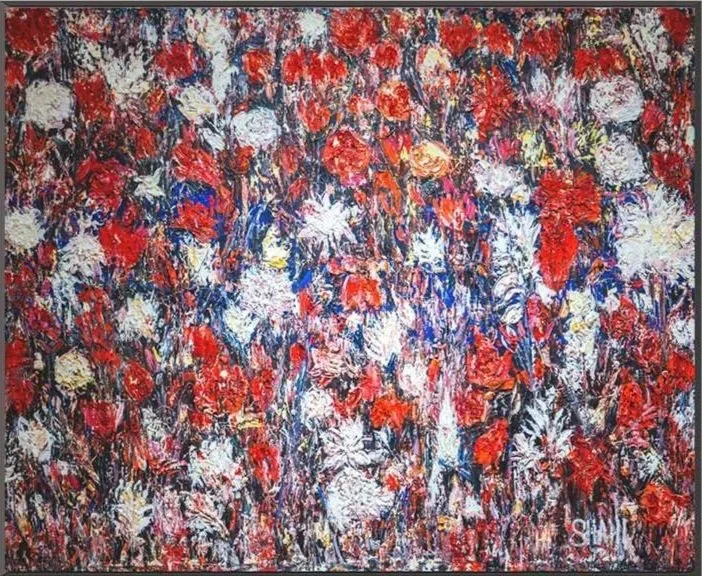 Camellia 2 Bewitches us with its ample pigments and its expressionistic design. It represents characteristics such as humility and compassion through its inclusion of floral designs. Shahi uses colors such as white to paint the flowers to depict the purity that is inclusive of these virtues. This encourages the viewer to indulge in these virtues as she promotes their value.