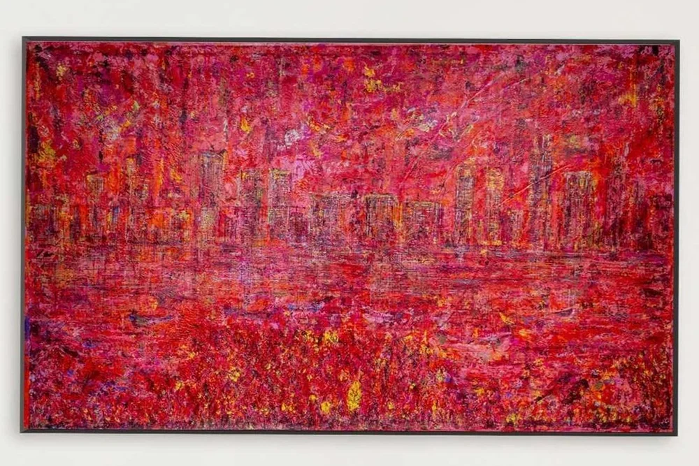 "Metropolis" is a vibrant mixed-media painting that captures the energy and movement of a buzzing cityscape and advocates unity. Shahi includes culturally significant buildings such as The Burj Khalifa, Big Ben, The Eiffel Tower, and Hagia Sophia to promote the harmonious ideology of unity. She does this to further embark on the importance of coexistence as a society and encourages the acceptance of diversity. Dominated by a fiery red hue, the canvas is alive with the textures and layers created through the artist's use of the impasto technique. The viewer is transported into a world of towering buildings, bustling streets, and dynamic city life that pulsates with energy.